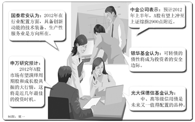 即将过去的2011年对于投资界来说是艰难的一年:国际国内经济形势变幻不定,股市和债市没有像往年一样产生投资上的“跷跷板”效应,在年中的多半时间里都同时陷于低迷,使基金公司、券商等市场主体面临巨大挑战。时值岁末,各大机构纷纷发布了2012年投资策略。总体来看,对于2012年A股市场及债券市场的表现,机构对于明年市场的走势表现出谨慎的乐观,不少机构认为2012年开年即有望演绎“开门”行情。