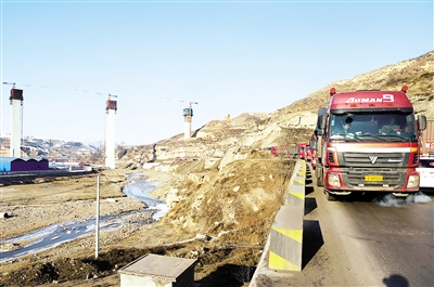 压题图片 12月8日,在施工中的中南铁路蔚汾河大桥工地边,大量煤运重卡正在313省道山西兴县段排队通过。 新华社记者 范敏达摄