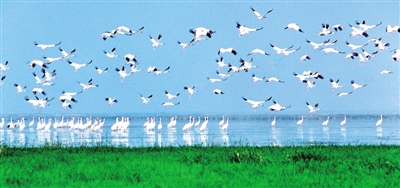 压题照片:鄱阳湖畔世界上最大的白鹤群。 林 魂摄