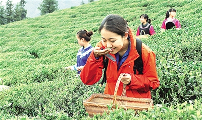 游客兴致勃勃地跟随苔茶姑娘在龙塘镇大屯茶场采摘茶叶。从2007年起,石阡苔茶每年以5万亩的速度推进,到2015年面积将达到30万亩,在农村实现人均一亩茶的目标。