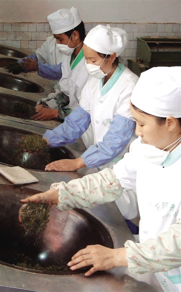 聚凤乡高原茶场的工人在加工石阡苔茶。面对现代企业的标准化、机械化制茶生产,石阡苔茶仍坚持传统的手工制茶工艺,为的是让品牌的价值名副其实。