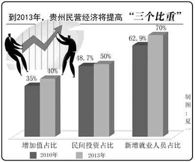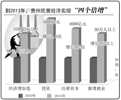 贵州省还启动实施了民营经济“三年倍增计划”,提出要经过3年努力,使该省民营经济发展实现“四个倍增”,提高“三个比重”,即到2013年底,全省民营经济增加值3200亿元以上,比2010年增长1倍以上;投资4000亿元,比2010年增长1.6倍;注册资本4000亿元,比2010年增长1.2倍;新增就业30万人以上,比2010年增长1倍以上;民营经济增加值占全省生产总值的比重从35%提高到40%,民间投资占全社会固定资产投资的比重从48.7%提高到50%,民营经济新增就业人员占全省城镇新增就业人员的比重从62.9%提高到70%。