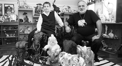 不久前,在乌克兰首都基辅,大象迷菲莫维奇和他的儿子在家里与他们收藏的大象工艺品合影。