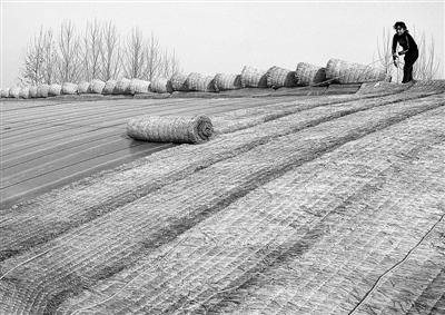 12月12日,在河南省中牟县刘集乡,一位菜农在给蔬菜大棚铺盖保暖草帘。 当地菜农利用天气晴好的时机,做好大棚防寒保暖工作,预防冻害发生,并抓紧高耐寒性大棚蔬菜的育苗和栽种。 新华社记者 王 颂摄