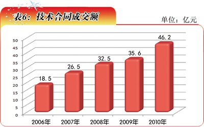 2010年,安徽省技术市场各类技术合同成交总数达4831项,各类技术合同成交额达46.2亿元(表6)。