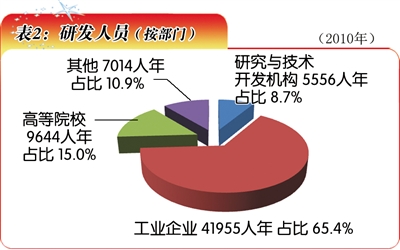 安徽省全社会研发全时人员总数大幅增长,从2006年的28825人年增长到2010年的64169人年(表2)。