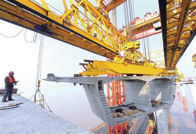 12月13日,施工人员正在操作架桥机进行架梁施工。