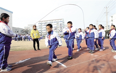 12月13日,苏州新庄小学的学生在跳绳。当日,苏州市金阊区小学生冬季三项体育锻炼活动正式启动。该区15所小学的12000多名学生将在冬季课余活动时段参加跳绳、踢毽子和长跑三项体育锻炼。 杭兴微摄(新华社发)