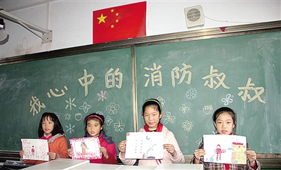 山东省烟台市新胜小学学生在展示消防漫画作品。近日,烟台消防支队联合市教育局开展消防漫画评选活动,共有10多万名学生参与。 文/本报记者 王金虎 图/通讯员 刘 明