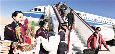左图 首批乘坐国航北京-拉萨直航飞机的乘客走下舷梯。 新华社记者 陶希夷摄
