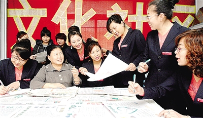 盘锦市兴隆台区兴隆街道文化社区,工作人员正在制作“文化社区报”。大家用事例说明转型给盘锦带来的变化:生活水平提高了,城市环境变好了,社区也更和谐了。