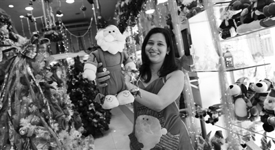 日前,在巴西里约热内卢的阿尔凡德加街,一名店员展示圣诞商品。圣诞节前的最后一个周末,里约小商铺林立的阿尔凡德加街人头攒动,人们都忙着为即将到来的圣诞节采购货品。 新华社发