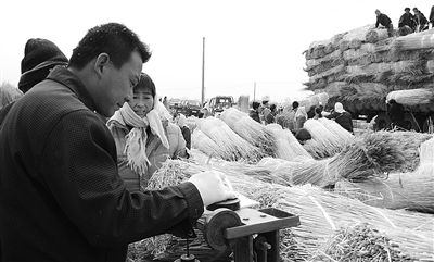12月23日,山东无棣县水湾镇苇子市场一派繁忙的交易景象。苇帘产业是水湾镇的传统产业,该镇拥有苇帘机2万余台,从业人员3万人,产品规格达20余种100多个型号,日产苇帘30多万片,产品出口日本、韩国等国家和地区,年创经济效益5000万元,是全国最大的苇帘加工出口基地之一。 王秀丽摄