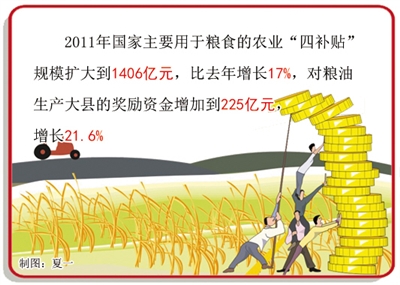 韩俊指出,粮食安全是国家安全的基础。粮食的平稳增产和供求平衡,对于我们这样一个发展中的人口大国而言永远是至关重要的问题。他表示,粮价要保持在合理的水平,要逐步增加对种粮农民的补贴,同时还要健全对粮食主产区的利益补偿机制。稳定粮食增产必须保持好农民的积极性,现在每斤粮食给的各种补贴加在一起不到9分钱,全国不到1角钱。粮食主产县全国有200个,每年中央财政给奖励,每斤粮食奖励的钱也不到2分钱。