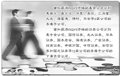 12月23日,证监会公布了首批获得RQFII资格的机构名单,包括了南方等9家基金管理公司的香港子公司,同时还有中金公司等12家券商香港子公司的下属资产管理公司获得试点资格。据悉,RQFII的200亿元人民币试点额度中,证券公司和基金公司将各占一半。证监会还表示,将会同有关部门研究论证进一步扩大试点的可行性,争取在机构类型、投资范围和投资比例等方面有所突破。