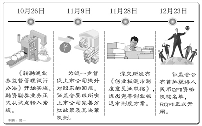 经过不到两年时间的发展,融资融券业务在今年迈出了关键的一步:10月26日,证监会宣布《转融通业务监督管理试行办法》开始实施,两天后又发布《关于修改〈证券公司融资融券业务试点管理办法〉的决定》和《关于修改〈证券公司融资融券业务试点内部控制指引〉的决定》,再加上中国证券金融股份有限公司正式成立,表明证券公司融资融券业务从试点转入常规。