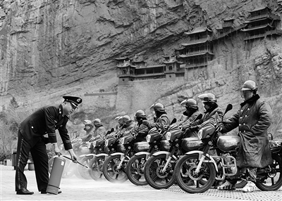 位于山西省大同市的北岳恒山景区有了一支摩托车消防队,20辆消防摩托车日夜在景区巡逻,排查火灾隐患,极大地提高了景区的防火能力。(李 哲 吴 伟)