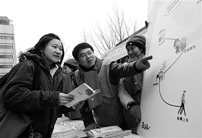 1月1日,北京西单文化广场。志愿者向过往行人发放北京地区铁路春运《服务指南》。 本报记者 赵 晶摄