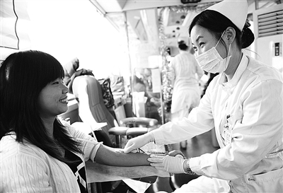 1月1日,北京市红十字血液中心王府井书店采血点,从黑龙江来京旅游的李媛用义务献血的形式过生日。 本报记者 李景录摄