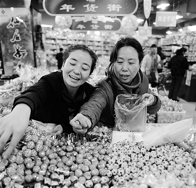 1月2日,顾客在宁夏银川某大型超市举办的年货街内选购糖果,当地节日市场呈现购销两旺的红火局面。 新华社记者 彭昭之摄