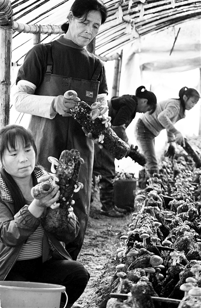 左图 江西省万年县大源镇敏泉食用菌合作社建起100多个香菇种植大棚,采取“基地加菜场”的直销模式,香菇直接进入超市和菜场。图为敏泉食用菌合作社社员在采摘香菇。 徐声高摄