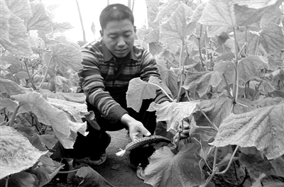 下图 河北省固安县前庞务村村民邢亮在打理自家暖棚里的黄瓜秧苗。目前,大量黄瓜上市有效缓解了前段时间北京市场黄瓜供应的不足。 乔金亮摄