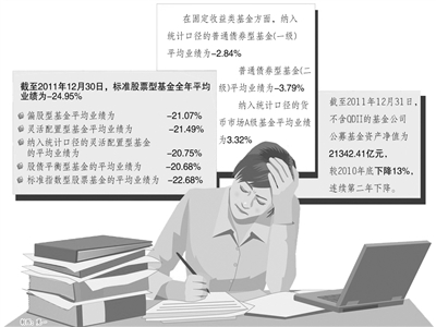 2011年A股市场大幅下挫,沪深300指数下跌25.01%,上证综合指数下跌21.68%,深证成份指数下跌28.41%,中小板指数下跌37.09%,创业板指数下跌35.88%,上证国债指数上涨4.05%。受大盘影响,去年标准股票型基金全年平均业绩为-24.95%,基金公司公募基金资产净值较2010年底下降13%。