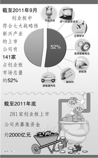 统计显示,截至2011年9月,创业板中符合七大战略性新兴产业的上市公司有141家,占创业板市场总量的52%;从主营收入来看,2010年战略性新兴产业研发支出占创业板市场研发总支出的63.78%,创业板公司51.8%的营业收入、55.98%的净利润来自战略性新兴产业。
