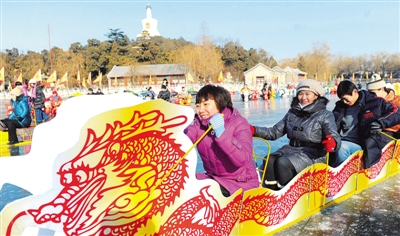 1月5日,北京北海公园滑冰场,市民坐冰车嬉戏。当天,北海公园启动迎春节祈福活动。 本报记者 赵 晶摄