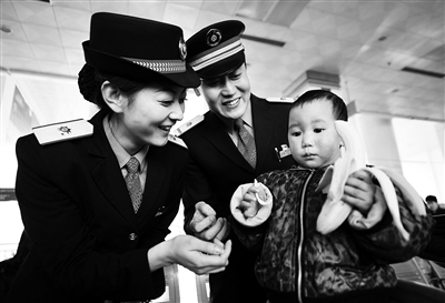 1月6日,兰州火车站的客运员在照顾一名小旅客。由于龙年春节与今年元旦日期接近,节前客流高度集中,春运工作面临更大压力。 新华社记者 张 锰摄