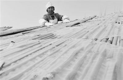 1月6日,山东邹平县西董镇刘家窝村村民在翻晾粉皮。春节临近,该村手工粉皮生产日益忙碌。这个村子用地瓜做原料的手工粉皮,被称为“水晶粉皮”,深受消费者欢迎。 董乃德摄(新华社发)