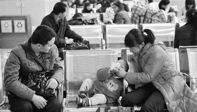 1月8日,吴增涛(前左一)一家三口在广州火车站候车。在今后的40天里,将累计有31.58亿人次乘坐各种交通工具出行。 新华社记者 卢汉欣摄