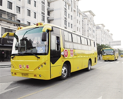 无锡市通过政府购买服务、企业微利运营、部门联合监管的措施,保障校车安全。 目前,无锡市共有校车570辆,部分实行公交化接送,全市每年财政补贴校车2000万元。图为惠山玉祁小学的12辆校车开往各个校车接送站点(2011年11月28日摄)。 沈 鹏摄(新华社发)