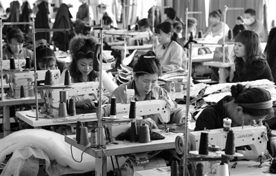 近年来,辽宁灯塔市佟二堡镇出台一系列扶持中小企业发展的优惠政策,鼓励服装加工企业“立足国内,放眼海外”。这些企业生产的高档服装不仅销往全国各地,还远销欧美等国家和地区。图为佟二堡镇一家服装企业的员工正在按照海外订单生产裘皮服装。 本报记者 苏大鹏摄