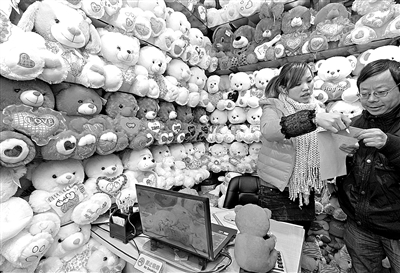 ◀义乌中国小商品城经营户余婕(左)在与一位客商核对毛绒玩具订单。 据浙江省义乌市工商局最新统计数据,2011年义乌中国小商品城成交额515.12亿元,同比增长12.95%,这是义乌中国小商品城成交额自1991年以来连续21年居全国专业市场榜首。 新华社记者 谭 进摄