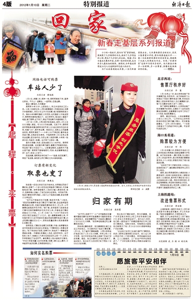 本报“新春走基层”报道将以“回家”作为采访活动的总栏题和主线索,设置“起程”、“在路上”、“团圆”、“访亲”、“再出发”5个部分,通过独特的视角报道经济社会的繁荣发展、和谐进步。