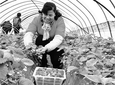 1月9日,安徽舒城县棠树乡三拐村龙泉农业科技中心的农民在大棚里采摘草莓。 当日,安徽舒城县龙泉农业科技中心与县城的华润苏果超市对接,直接将新上市的无公害草莓上架销售。 许 兵摄(新华社发)