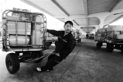 1月9日,在江西南昌火车站,一家快运公司的工作人员在移动包裹准备装车。随着农历新年的临近,网上购物已成为许多人置办年货的方式之一,各大快递公司迎来了春运高峰期。 胡国林摄 (新华社发)