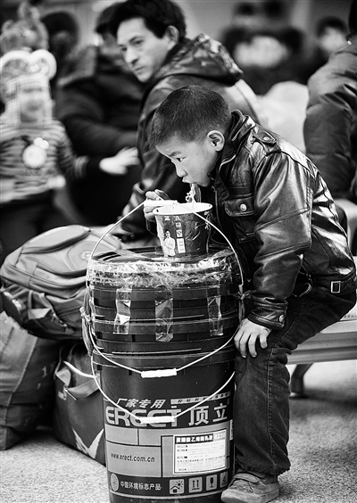 右图:1月8日,希思航小朋友在银川火车站候车室内吃方便面,一直跟随打工的父亲生活在宁夏的他准备要返回老家过春节。