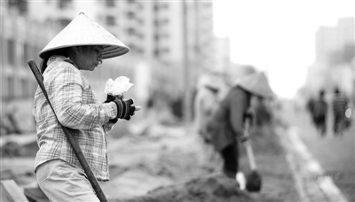 下图:1月2日,一名农民工在海南琼海市市政工程工地吃早餐。