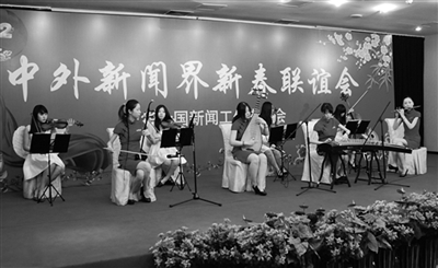 1月11日晚,由中华全国新闻工作者协会举办的“2012中外新闻界新春联谊会”在中国记协一楼新闻大厅举行。图为联谊会现场表演。 冯振宇摄