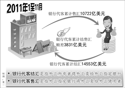 外汇局最新公布的数据显示,2011年11月,银行代客结汇为1289亿美元,银行代客售汇为1297亿美元,银行代客结售汇逆差为8亿美元,这是该数据自2010年1月按月份公布以来首次出现逆差。此外,2011年1月至11月,银行代客累计结汇14553亿美元,累计售汇10722亿美元,银行代客累计结售汇顺差3831亿美元。