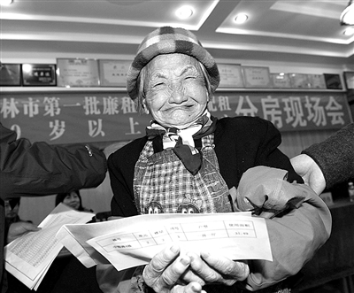 广西桂林市82岁老人唐玉妹通过抽签摇号获得廉租房后喜极而泣。 新华社发