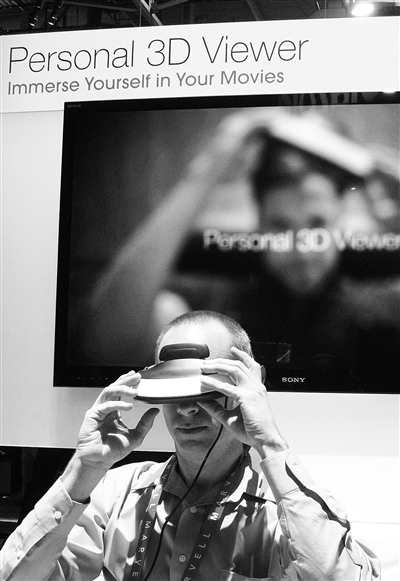 右图 1月11日,在美国拉斯韦加斯国际消费电子展上,一名参观者正在试用索尼公司推出的新款头戴式3D显示器。
