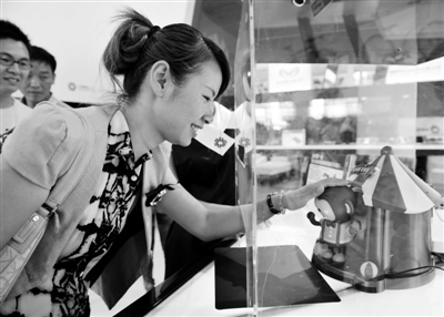 在去年的中国——东盟博览会上,中国台湾台北世界贸易中心首度组团亮相,带领琉璃工坊、帝凯国际实业、华仕德科技等众多台湾企业,展出100多个品牌的商品和最新产品,借道博览会进军东盟市场。图为在广西南宁国际会展中心台湾精品馆,一名女士在尝试与娱乐机器人交流。 张爱林摄 (新华社发)
