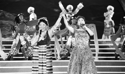 下图:2012年中国文联新春联欢会上,著名歌唱家才旦卓玛、李谷一共同演唱《一个妈妈的女儿》。 孟祥宁摄