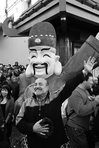 | 右图 1月14日,在美国旧金山唐人街,一名美国人在年宵花市合影。为期两天的旧金山“年宵花市”于当日开幕。这是由旧金山中华总商会主办的中国新年系列庆祝活动的第一项。 (新华社发) |
