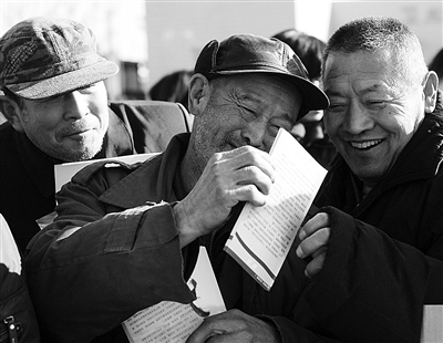 左上:北京市发放农业技术、医药卫生等各类书籍,受到普遍欢迎。图为村民在领取宣传手册。
