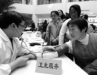 左下:江苏省为村民进行义诊服务。图为医务人员为村民进行免费体检。杭兴微摄(新华社发)