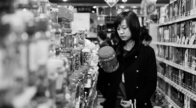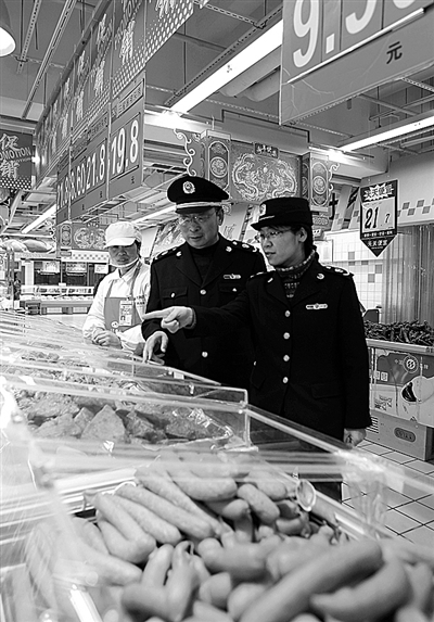 左图 山东即墨市工商局执法人员在一家超市检查食品。